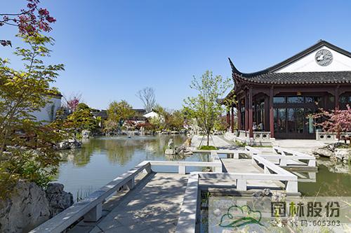 除了植物、園路等,建筑、曲橋、廊架、照壁等也在園區內錯落有致地分布,在有序劃分空間的同時,營造出移步換景的園林景觀。