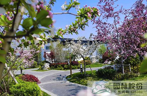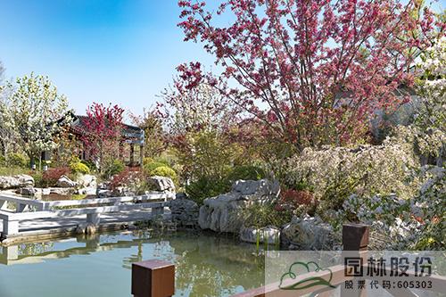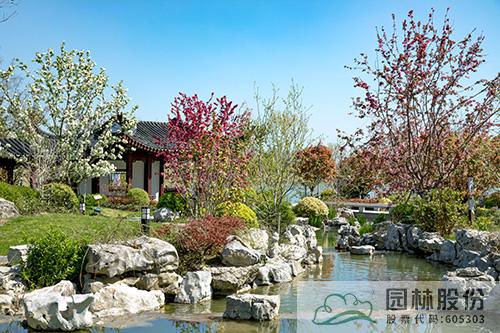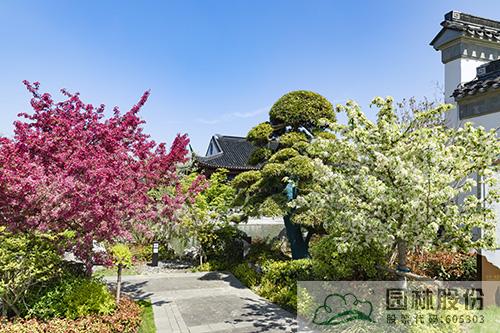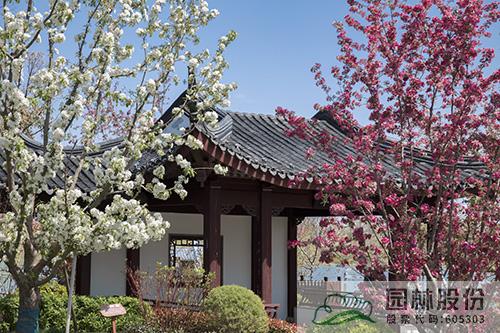 穿過迎賓入口,沿著曲折的園路前行,道路轉折處,一紫一白盛放的兩棵海棠,滿樹繁花,明艷動人,瞬間奪人眼球。“這是一個流動空間,穿過這兩棵海棠,往左轉,是海棠書院,院子前形成一個停留空間,可供游人在此駐足賞景。” 邊華鋒指著眼前的景觀介紹道,“往右轉,一棵枝繁葉茂的雞爪槭位于草坪中間,與周邊幾棵小規格的雞爪槭相互呼應,形成一個過渡空間,但這個空間和前面的空間大小、表現手法又各不相同。”