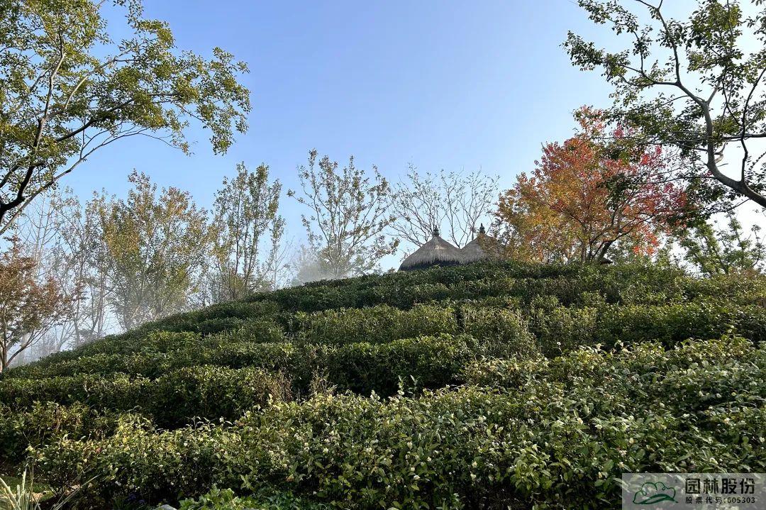 這其中運用到了茶樹地轉容的管理技術和大型苗木的土球加固技術,為保證茶山景觀效果完美呈現,技術人員采取了一系列措施,包括開挖前先修剪嫩芽、噴施蒸騰抑制劑以及根據季節變化采取相應遮陽、施肥、預防病蟲害等相應措施,經過幾個月的精細化養護,最終達到“問茶”片區的景觀效果。